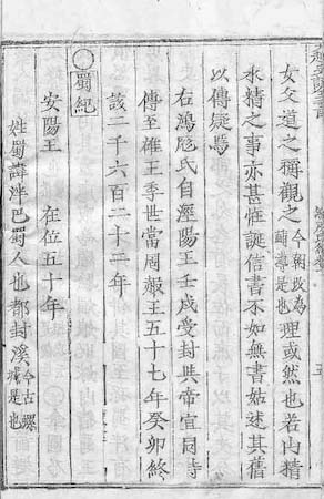 女 父 道 之 稱 觀 之 今 朝 改 爲 輔 導 是 也 理 或 然 也 . [5b*1*1] nữ phụ đạo chi xưng, quan chi [Kim triều cải vi phụ đạo thị dã] lí hoặc nhiên dã. 若 山 精 水 精 之 事 亦 甚 恠 誕 信 書 不 如 無 書 姑 述 其 舊 以 傳 疑 焉 . [5b*1*20] Nhược Sơn Tinh, Thuỷ Tinh chi sự, diệc thậm quái đản, tín thư bất như vô thư, cô thuật kì cựu dĩ truyền nghi yên. 右 鴻 庞 氏 自 涇 陽 王 壬 戌 受 封 與 帝 宜 同 時 傳 至 雄 王 季 世 當 周 赧 王 五 十 七 年 季 卯 終 該 二 千 六 百 二 十 二 年 . [5b*4*1] Hữu Hồng Bàng thị, tự Kinh Dương Vương Nhâm Tuất thụ phong, dữ đế Nghi đồng thời, truyền chí Hùng Vương quý thế, đương Chu Noãn Vương ngũ thập thất niên Quý Mão chung, cai nhị thiên lục bách nhị thập nhị niên. 蜀 紀 安 陽 王 . [5b*7*1] Thục Kỷ An Dương Vương. 在 位 五 十 年 . [5b*8*4] tại vị ngũ thập niên. 姓 蜀 諱 泮 巴 蜀 人 也 都 封 溪 今 古 螺 城 是 也 . [5b*9*1] Tính Thục, huý Phán, Ba Thục nhân dã, đô Phong Khê [Kim Cổ Loa thành thị dã].